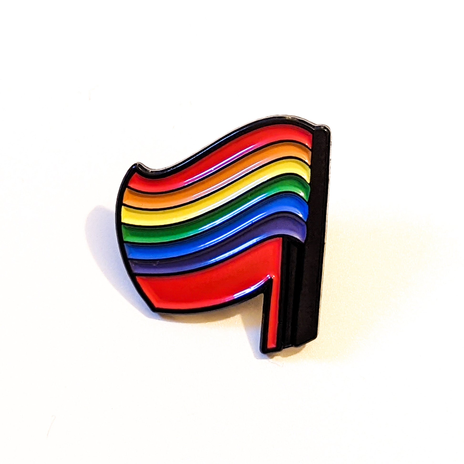The pin is approximately 3cm (1 3/16 inches), and has black metal with vibrant colours on the rainbow pride flag and red flag.